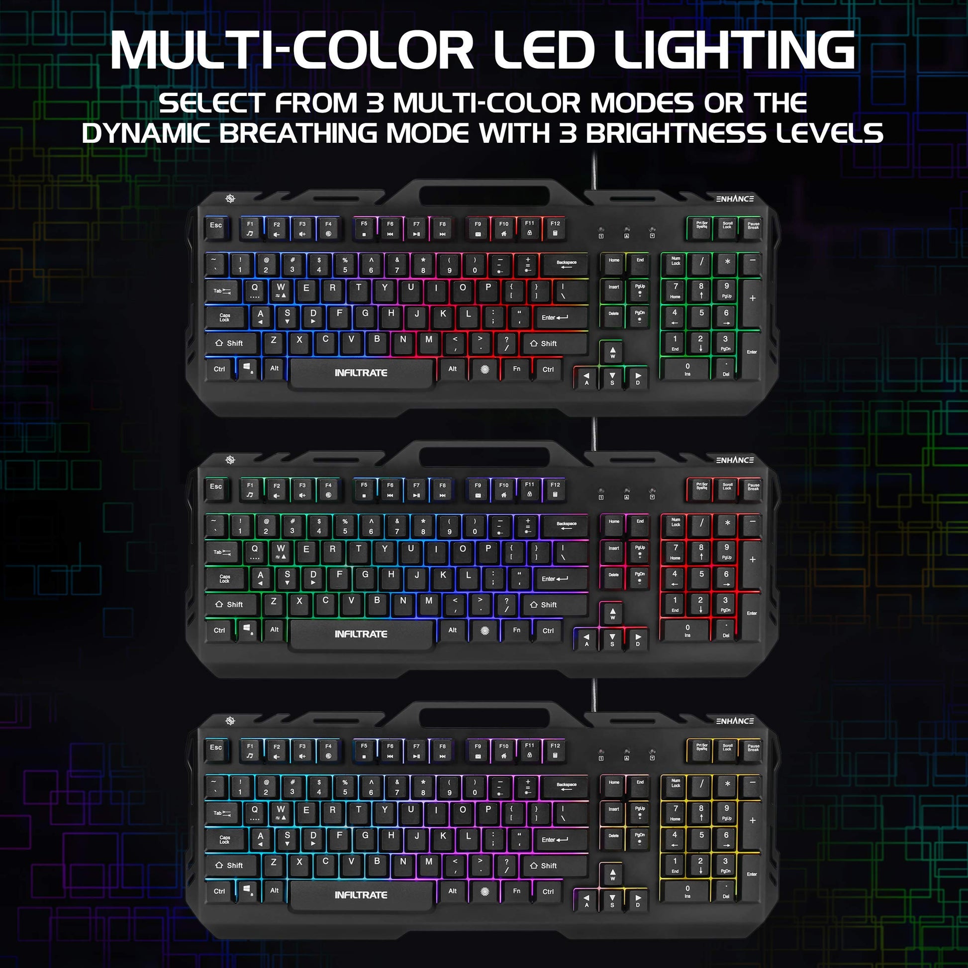 ENHANCE Infiltrate KL2 Membrane Gaming Keyboard - Quiet Keyboard with 3 Multi Color LED Lighting Modes, Turbo Input Mode, Anti-Ghosting, 19 Key Roll Over, Slim Low Profile Metal Design